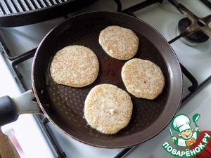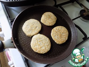 Выпекаем оладьи. Оладьи не будут пышными, но на вкусе это не отразится. Разогреваем масло в сковороде и столовой ложкой выкладываем оладьи. Один оладий-одна ст л теста. Жарим с одной стороны до красивого цвета и чтобы оладушки схватились.
