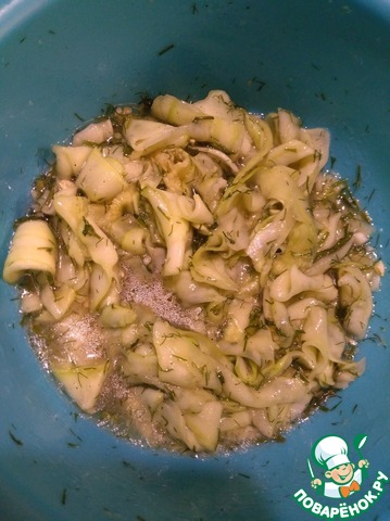 С кабачков слить жидкость, добавить порезанный укроп, заливку, перемешать, и убрать в холодильник на 2 часа. Хорошо, если за это время вы несколько раз перемешаете будущую вкусняшку.