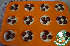 Разложить тесто по формам на треть. Сверху выложить ягодки крыжовника. Можно использовать любые формы на ваш вкус. Здесь у меня силиконовая форма для маффинов.