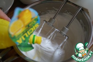 3 яичных белка взбиваем до устойчивых пиков добавляя понемногу оставшийся сахар, затем добавляем крахмал и лимонный сок, еще раз взбиваем.