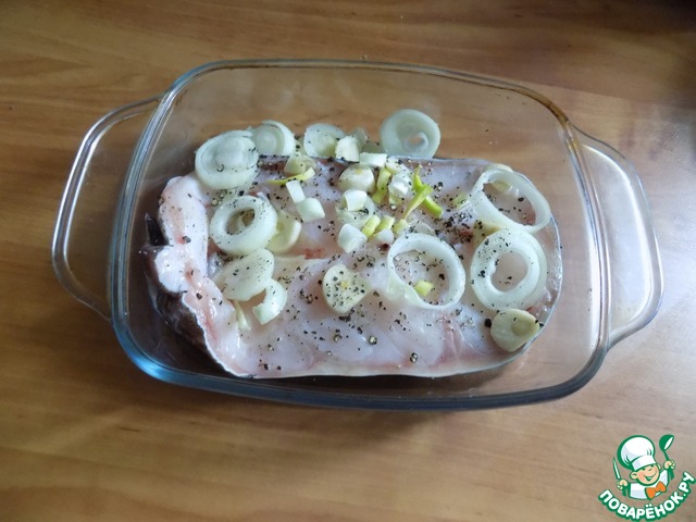 Я взяла кусок сома весом 700 г. Помыла, обсушила, посолила его, поперчила свеже-молотым перцем и выложила в форму, где и буду потом его запекать. Порезала чеснок, лук, отжала лимонный сок из половинки лимона, добавила масло оливковое и поставила мариноваться на пол-часа. Пару раз перевернула.
