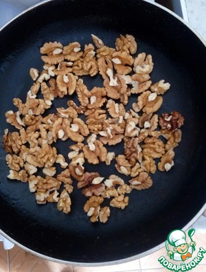 Первым делом подготавливаем орехи и изюм. Промываем и замачиваем изюм в кипятке на 15 минут. Затем займёмся орехами. Орехи следует обжарить на сухой сковороде. Встряхиваем сковороду, чтоб орехи равномерно поджарились и не подгорели.