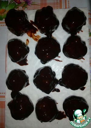 Растапливаем шоколад на водяной бане или в микроволновке. На вилке погружаем шарик в растопленный шоколад, перекладываем конфету на лист пергамента. Так поступаем со всеми конфетами. Ставим в холодильник до застывания шоколада на 1-2 часа.