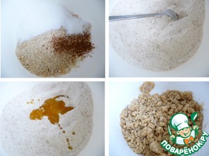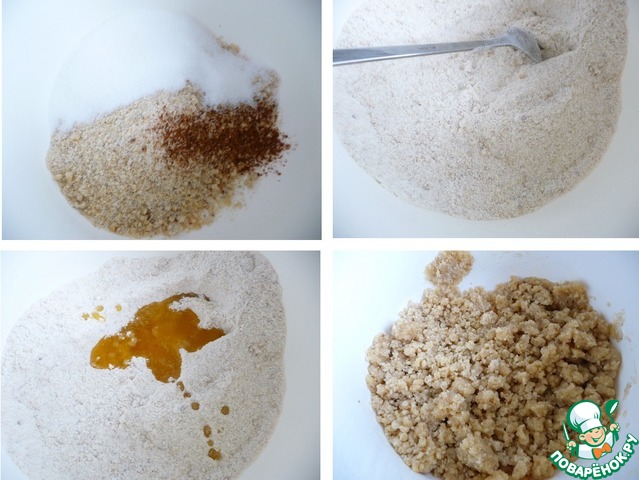 Для приготовления крошки (штрейзеля), в миске смешать орехи, сахар, муку, корицу, перемешать. Постепенно вливать масло в сухую смесь и взбивать миксером, насадка крюк.