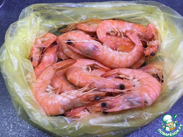 И креветочки)) у меня были не замороженные, предварительно отваренные (купила уже такие)... количество креветок зависит от ваших аппетитов))