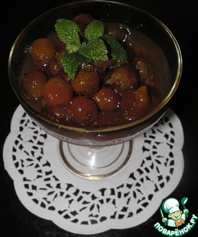 Я бы даже сказала, что черешня становится карамелизированной, а в сочетании с орехом - больше похоже на конфету с начинкой. Подавала такой десерт гостям к шампанскому, отличный тандем, все были в восторге!!!