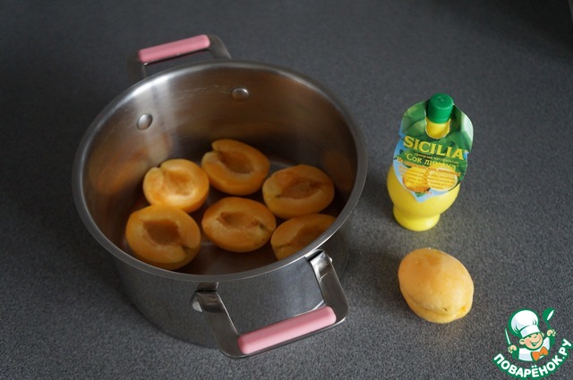Абрикосы разделить на половинки, выложить в сотейник или кастрюлю с толстым дном. Добавить сахар, воду и лимонный сок.