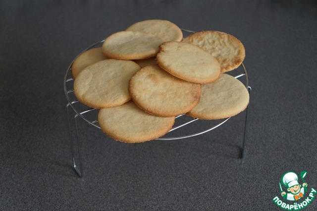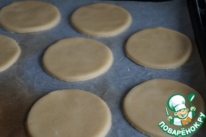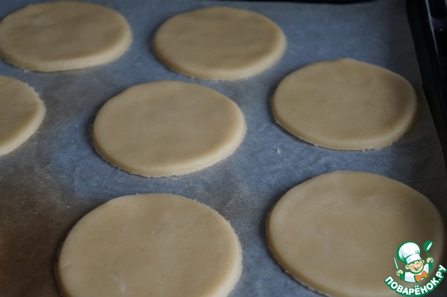 Разогреть духовку до 180 градусов. Тесто раскатать на припыленном мукой столе. Вырезать кружки. Перенести на противень.