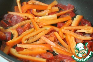 Всыпаем свежий перец, добавляем сахар и обжариваем на сильном огне пару минут - перец не должен стать очень мягким.