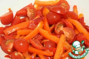 Выкладываем перец в емкость (масло после обжаривания оставляем на сковороде), на перец нарезаем кубиками помидор - у меня были черри.