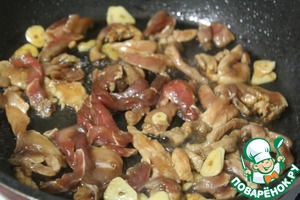 Мясо вместе с маринадом обжариваем на сильном огне около 5 минут - жидкость должна полностью выпариться. Сковорода должна быть большого диаметра или обжаривайте порциями - мясо не должно тушиться!