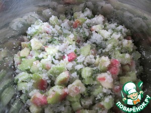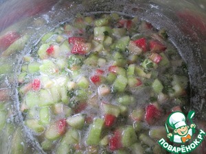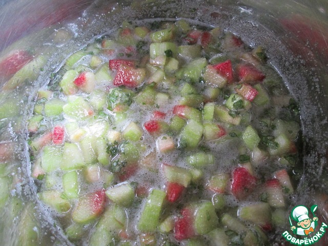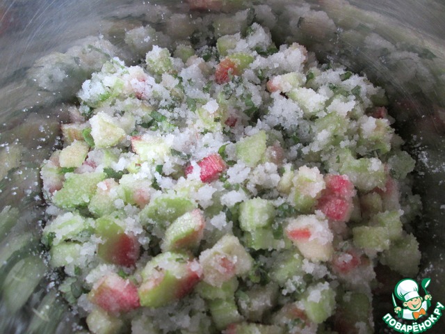 Смешать мяту и ревень, добавить 2 ст. л. воды и сахар. Всё перемешать.