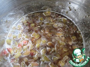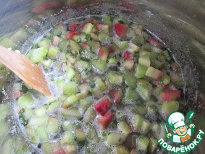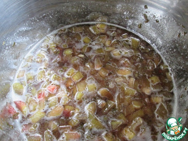 Доводим до кипения и варим, помешивая, 30 минут до размягчения ревеня.
