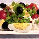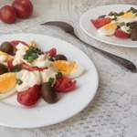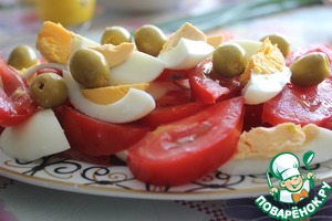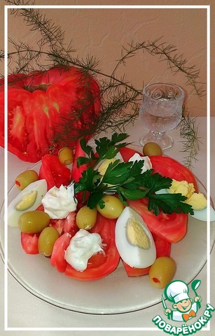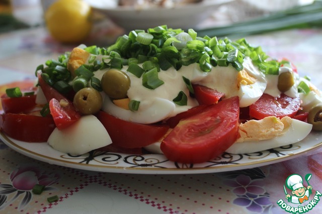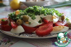 Нарезаем крупными дольками помидоры и вареные яйца. Все выкладываем в блюдо, присаливаем каждый слой.