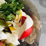 Выкладываем на верх оливки. Готовим заправку. Смешиваем ложечкой сметану, майонез, горчицу, лимонный сок, сахар, черный перец в чашке. Досаливаем заправку по вкусу.