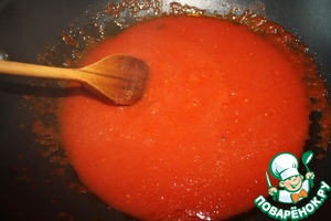 Раскалить масло и обжарить массу, пока не пойдет ароматный запах жареных томатов, добавить пол чайной ложки сахара и мелко нарезаный перчик чили.