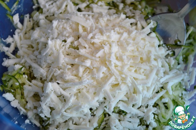 Добавить к отжатым кабачкам натертую брынзу и перемешать.