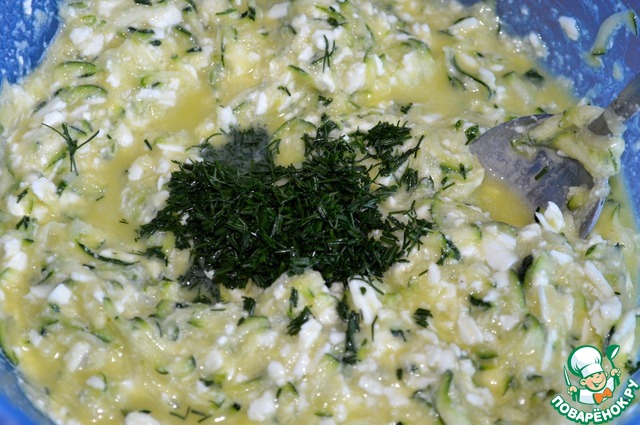 Приправить кабачки перцем, добавить рубленный укроп и муку. Перемешать, если нужно, подсолить. -
