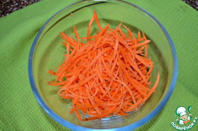 Морковь вымыть, почистить, натереть на "корейской" терке.