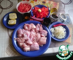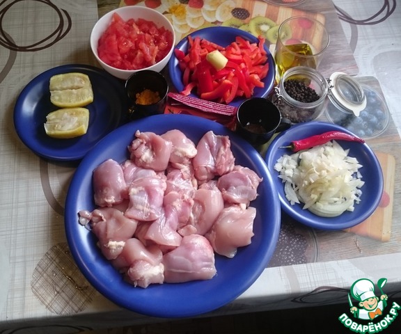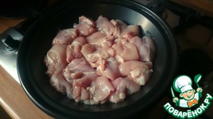 Курицу нарезаем на куски. Не могу сказать размер, ну чтобы на вилку можно было наколоть.