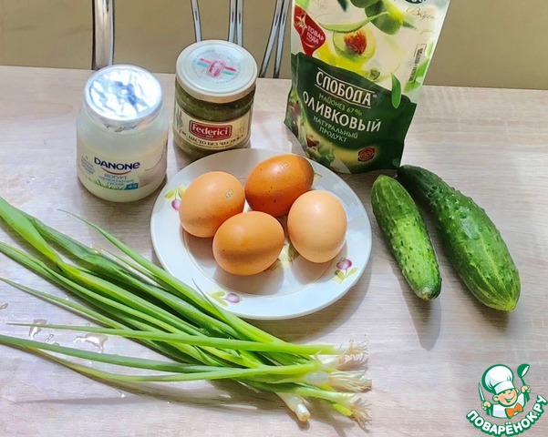Смешайте зеленый луку с огурцами, яйцами и заправкой. При желании еще посолите поперчите.