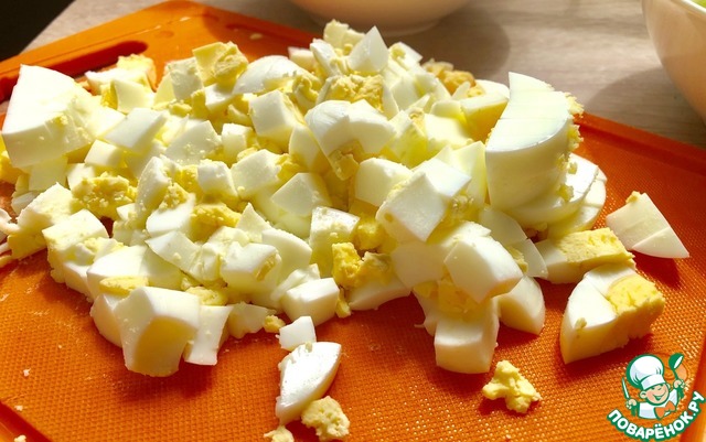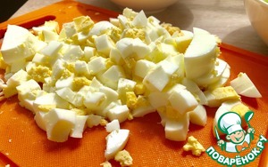 Первым делом надо сварить яйца. Предлагаю это сделать следующим образом: положите холодные яйца в кипящую круто посоленную воду. Как вода снова закипи, засеките 2 минуты, закройте крышкой и выключите огонь. Через 10 минут слейте воду, остудите яйца под проточной холодной водой, очистите и порубите не очень мелко.