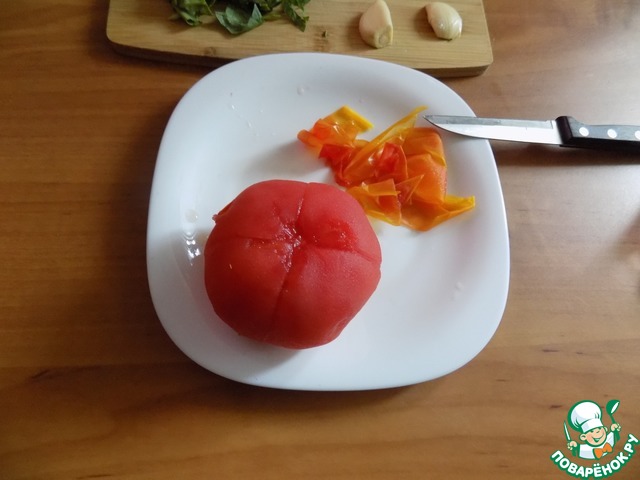Помидор надсекаем крестом, нам нужно снять с него кожицу. Помидор крупный и кожица у него толстая. Для этого опускаем его в кипяток на минуту.