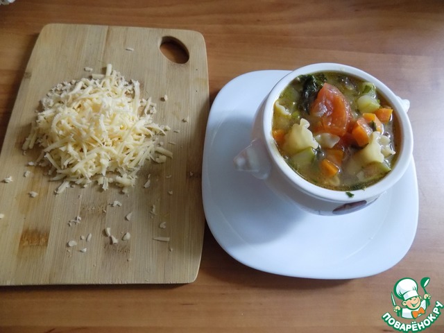 Натираем сыр на тёрке. Разливаем суп по тарелкам.