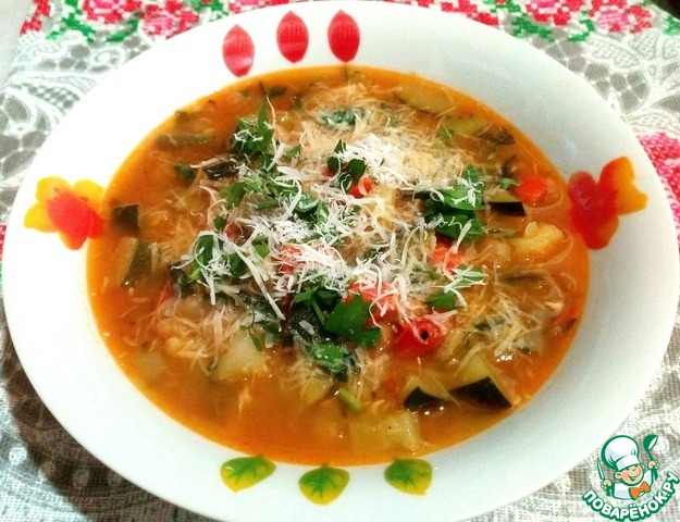 На фото набор овощей для моего минестроне. Бульон нужно сварить заранее. Я сварила бульон из индейки.