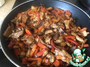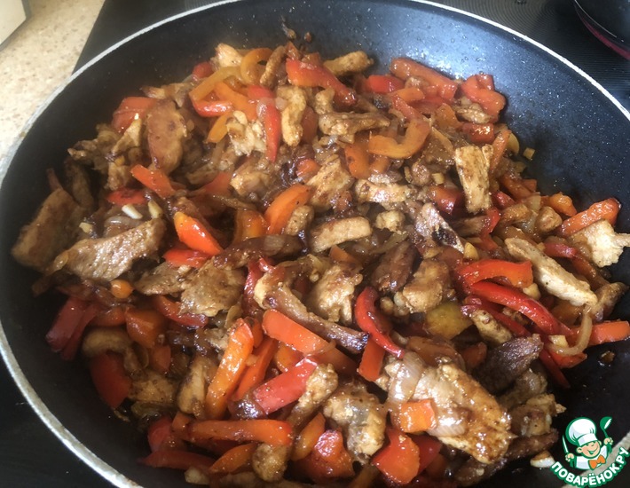 Когда мясо обжарилось, добавляем сначала лук, обжариваем вместе, затем болгарский перец, затем чеснок и постоянно помешиваем.