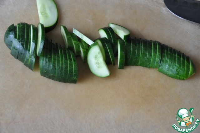 Берём огурец, режем тонкими полукольцами, в оригинальном рецепте использовался авокадо.