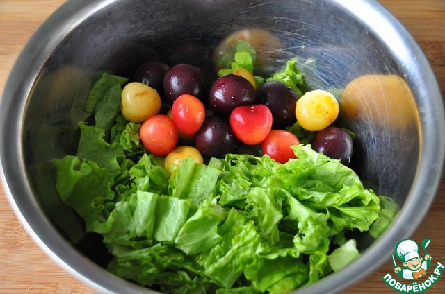 Листья салата моём, обсушиваем бумажным полотенцем, кладём к огурцам в миску. Также промываем черешню, откидываем на дуршлаг, добавляем в салат.