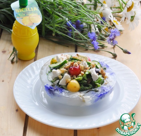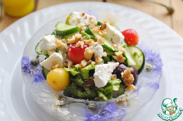 Готовый салат кладём в сервировочную тарелку, я для эффекта подавала в специально приготовленной ледяной вазе. Сверху кладём кусочки козьего сыра, посыпаем дробленным, обсушенным на сковороде грецким орехом.