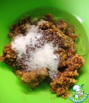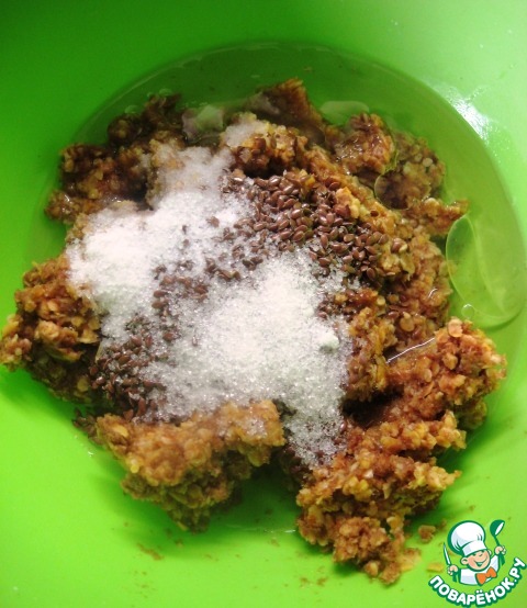 В миске, где будем замешивать тесто соединить смесь гороховых хлопьев и отрубей, семена льна. Влить воду комнатной температуры и растительное масло. Добавить соль и сахар.