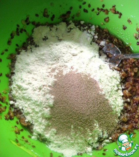 Добавляем муку и дрожжи, начинаем замешивать тесто.