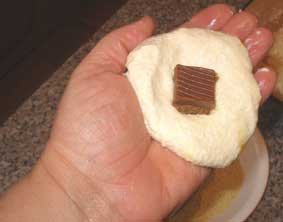 Размять в лепешку на ладони, в середину положить ирисочку. И скатать обратно в шарик.