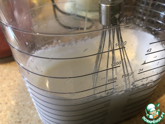 Взбиваем сливки 33 процентной жирности с 2 ст. л. сахара до жестких пиков. Затем добавляем пачку маскарпоне и немного перемешиваем все вместе миксером.