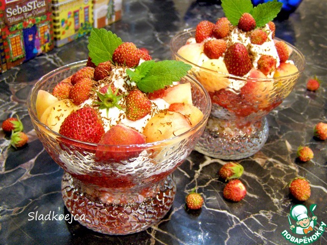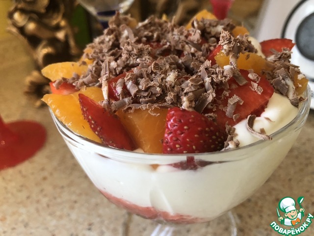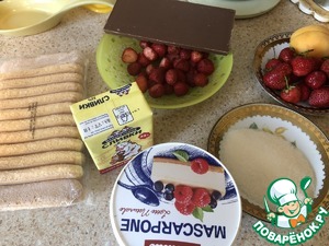 На дно креманки ломаем кусочками печенье савоярди. Поливаем протертой клубникой, сверху выкладывем массу и украшаем фруктами, ягодами и шоколадкой! Приятного Вам аппетита!!!
