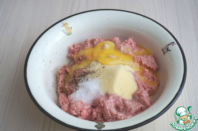 В фарш (свинина+говядина) добавить 1 яичный желток, 2 ст. ложки семолины (можно заменить обычной манной крупой), добавить черный молотый перец и соль по вкусу. Фарш хорошо вымешать.