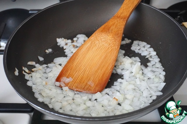 На сковороду добавить 2 ст. ложки растительного масла, добавить нарезанный репчатый лук, слегка потушить до прозрачности.