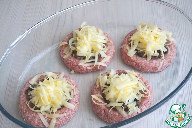 Сверху конструкцию посыпать натертым сыром и отправить в разогретую до 190-200*С духовку для запекания.