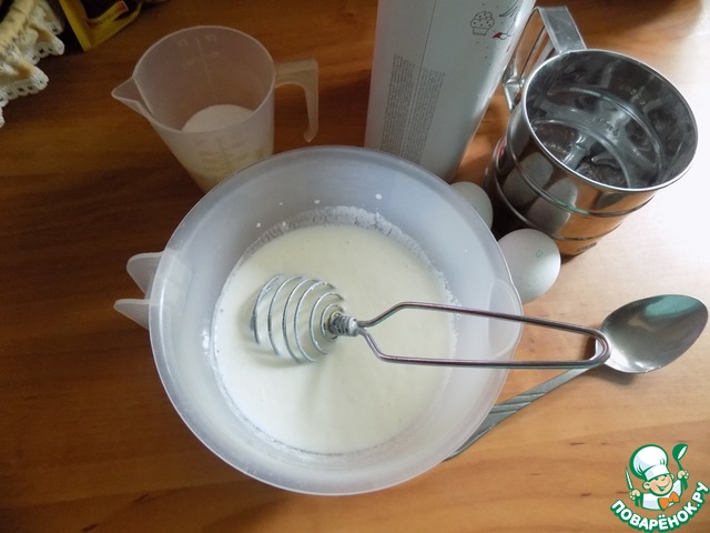 Замешиваем тесто. В простоквашу положила разрыхлитель, дождалась реакции и добавила сахар, соль и яйца. Всё венчиком соединила.
