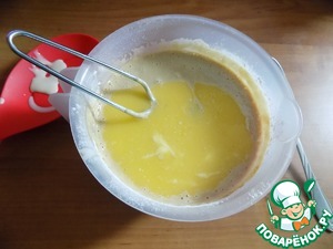 Добавляем в тесто кофе, венчиком соединяем, затем-масло. Опять тщательно соединяем.