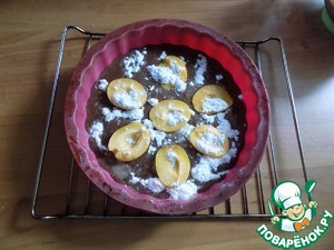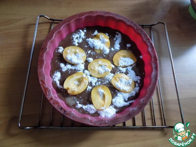 Я взяла силиконовую форму D-22 см и высотой 5 см. Намочила её. Вылила половину теста. Форма у меня переворачивается после выпечки. Абрикосы я разрезала пополам, вынула косточку, выложила половинками выпуклыми вниз. Сначала тесто присыпала сахарной пудрой, далее абрикосы и опять сахарная пудра.