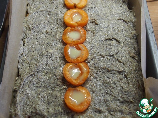 На абрикосы, опять же используя намоченную в воде ложку, распределить маковое тесто.
