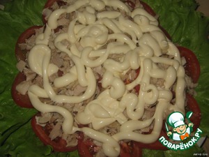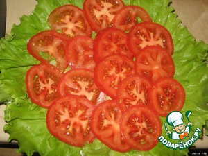 Помидоры нарезать колечками и выложить на салат. Слегка посолить и поперчить.
