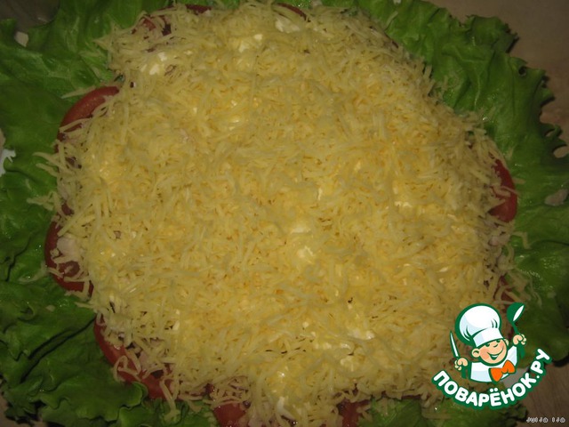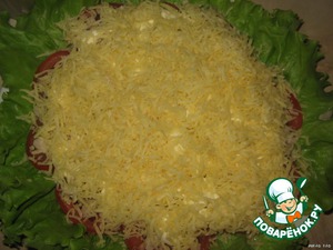 Посыпаем всё натёртым на мелкой тёрке сыром.