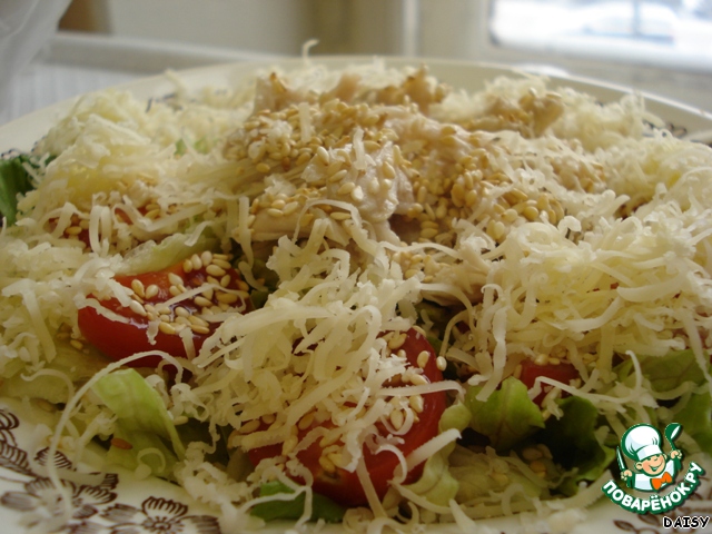 Я не смогла дать никакого другого названия! Я влюбилась в него с первого взгляда. Сочетание свежести (помидорчики и листовой салат) с сытной курочкой и сыром. А посыпано всe ароматнейшими и вкуснейшими кедровыми орешками. Попробовала я его на Дне рождения у подруги, и потом делала дня три подряд. Это правда очень вкусно! И очень быстро и легко готовится.