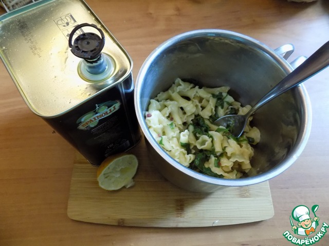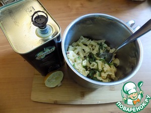 Откидываем на дуршлаг, чтобы слилась жидкость и отправляем опять в кастрюлю. Заправляем свежевыжатым соком из лимона и оливковым маслом. Перемешиваем.