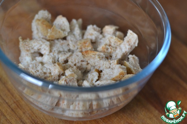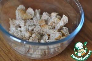 Булочку или рогалик нарезать на кусочки и залить молоком. Оставить на 10 минут.